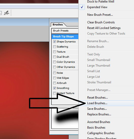 - lalu extract file yang tadi sudah didownload dan cara memasukkannya dalam tools brush photoshop dengan cara klik brush > maka muncul panel brush dan kolomnya disebelah kanan dan klik icon option tersebut kemudian pilih load brushes dan akan terbuka kolom pencariannya dan sobat temukan pada folder ABR downloadtan sobat tadi